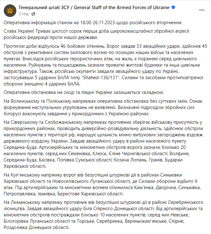 Атака на Україну та ситуація на фронті — вечірнє зведення Генштабу ЗСУ