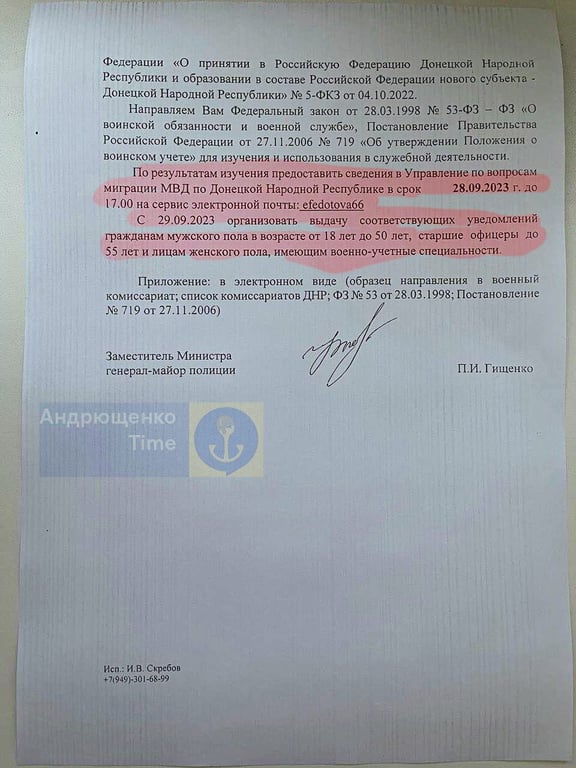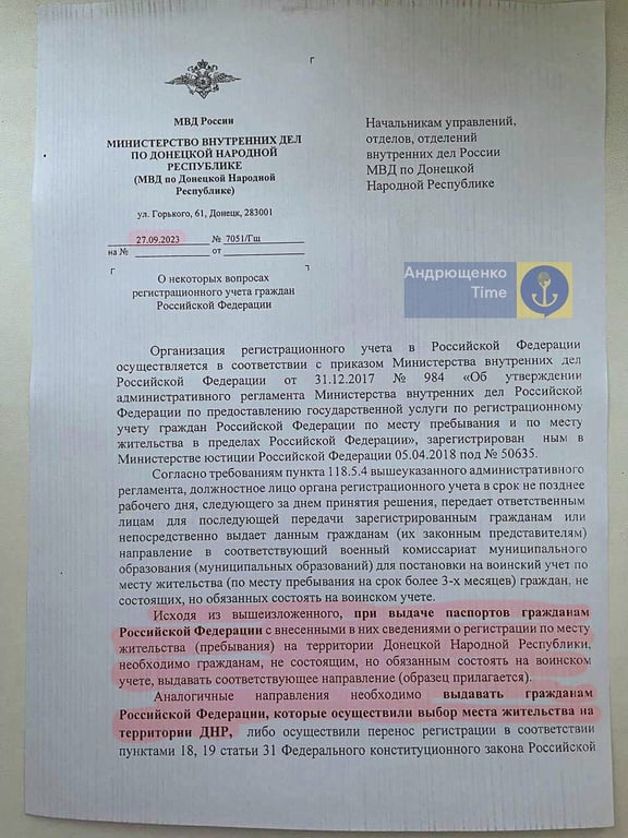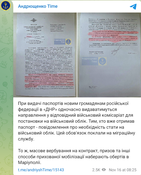 За його словами, під час того, як видаються паспорти РФ для нових громадян країни-агресора в "ДНР", будуть разом з ним видавати скерування, тобто повістку, до відповідного військового комісаріату для того, аби людина ставала на військовий облік.