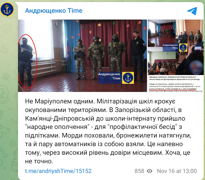 Андрющенко також згадав і про те, як проходить "мілітаризація" шкіл на інших окупованих територіях, зокрема на Запоріжжі.