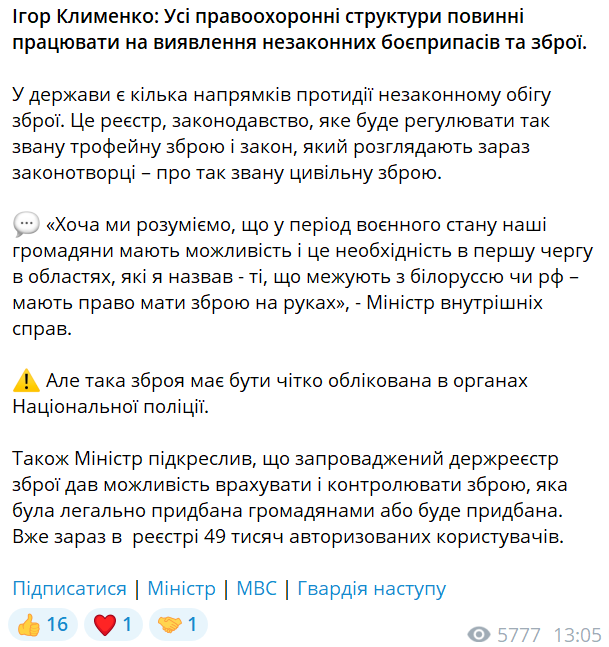 "Хоча ми розуміємо, що у період воєнного стану наші громадяни мають можливість, і це необхідність в першу чергу в областях, які я назвав — ті, що межують з Білоруссю чи РФ — мають право мати зброю на руках", — сказав Клименко.