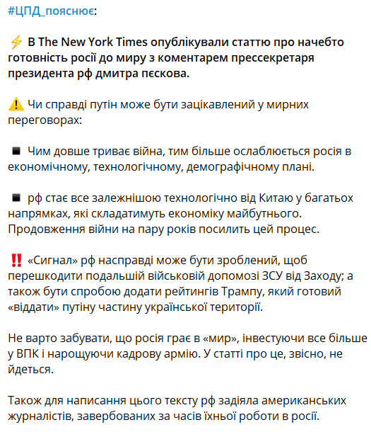 Матеріал The New York Times про "готовність" Росії до проведення мирних перемовин з Україною може бути розціненений як перешкоджання наступній військовій допомозі від країн Заходу. Також це може зіграти на руку Дональду Трампу, який у випадку своєї перемоги на президентських виборах, "віддасть Росії половину України".