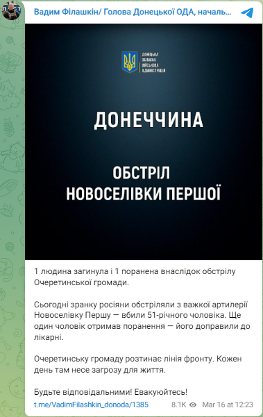 Російська Федерація обстріляла село Новоселівка Перша Донецької області з важкої артилерії. Внаслідок цього відомо про щонайменше одного загиблого.
