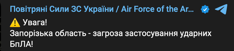 У Запорізькій та Донецькій областях оголошено повітряну тривогу. Над Запорізькою областю є фіксація ворожих БпЛА. За попередньою інформацією, це дрони типу "Шахед".