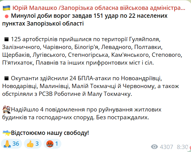 "125 артобстрілів прийшлися по території Гуляйполя, Залізничного, Чарівного, Білогір'я, Левадного, Полтавки, Щербаків, Лугівського, Степногірська, Кам'янського, Степового, П'ятихаток, Плавнів та інших прифронтових міст і сіл", — говориться у повідомленні.