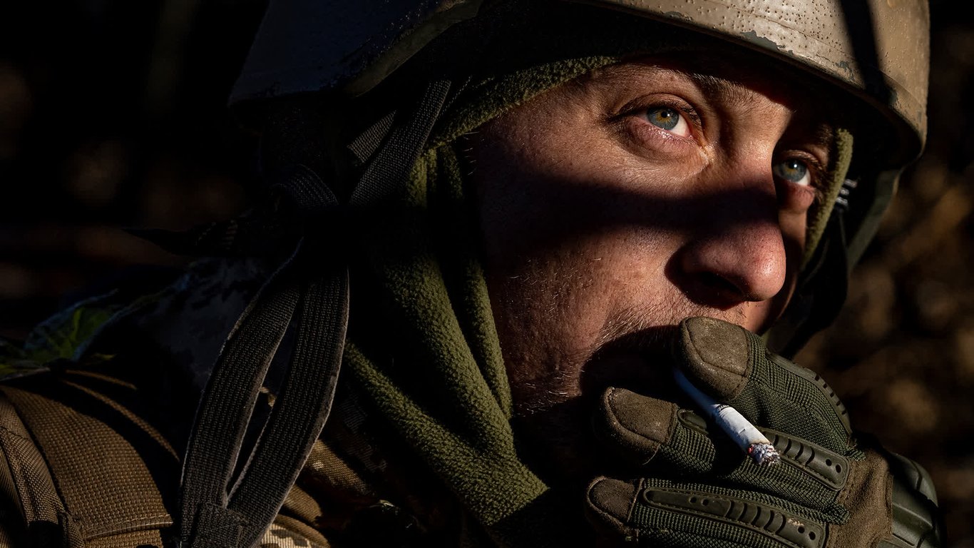 Український військовий курить сигарету неподалік Бахмута на передовій лінії війни Росії проти цієї країни. Євген Малолєтка/AP