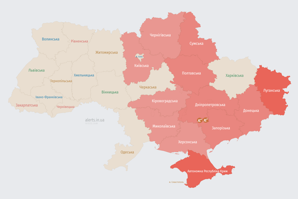 Сьогодні ввечері, 15 грудня, в деяких областях України оголосили повітряну тривогу. Зафіксовано рух російських безпілотників.