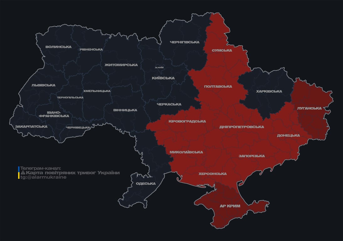 Сьогодні близько 14:09 східними та південними областями України почала ширитися повітряна тривога. Відтак, "почервоніли" Сумська, Полтавська, Кіровоградська, Миколаївська, Херсонська, Запорізька, Дніпропетровська та Донецька області.