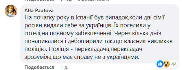 "На початку року в Іспанії був випадок, коли дві сім'ї росіян видали себе за українців. Їх поселили у готелі, на повному забезпеченні. Через кілька днів понапивалися і дебоширили так, що власник викликав поліцію. Поліція викликала перекладача, перекладач зрозуміла, що має справу не з українцями", — додали в коментарях.