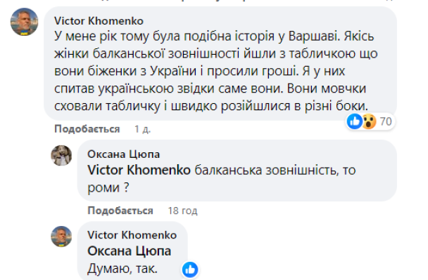 "У мене рік тому була подібна історія у Варшаві. Якісь жінки балканської зовнішності йшли з табличкою, що вони біженки з України і просили гроші. Я у них спитав українською, звідки саме вони. Вони мовчки сховали табличку і швидко розійшлися в різні боки", — зазначив Віктор Хоменко.