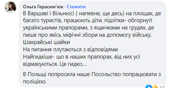 "В Варшаві і Вільнюсі (напевне, ще десь) на площах, де багато туристів, працюють підлітки, обгорнуті українськими прапорами, з ящичками на грудях, де пише про якісь міфічні збори на допомогу війську. Шахрайські шайки. На питання плутаються з відповідями. Найгидкіше, що в наших прапорах, від них усі відмахуються", — написала своєю чергою голова Нацради з питань телебачення і радіомовлення Ольга Герасим'юк.