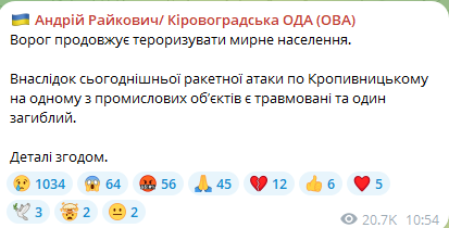 "Під час сьогоднішнього ракетного удару по Кропивницькому на території промислового підприємства сталися травми й зафіксовано одну смерть", — заявив він.