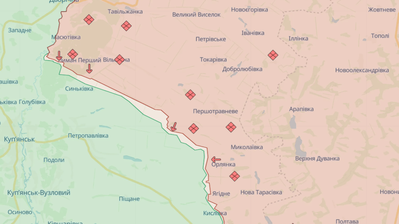 - Зеленым — территории, захваченные россиянами за время полномасштабного вторжения, но затем освобожденные Силами обороны Украины.