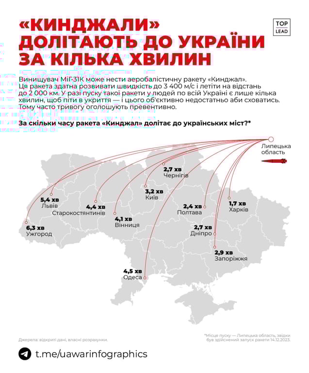 Как долго летит "Кинжал" до украинских городов, смотрите в инфографике UA War Infographics.