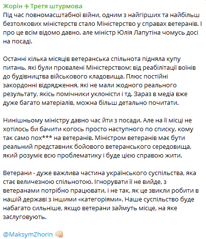 Экс-командир полка "Азов", заместитель командира третьей ОШБр Максим Жорин заявил, что необходимо уволить действующего Министра по делам ветеранов. Однако на ее месте не хотелось бы видеть кого-то просто следующего по списку, "кому так же пох*** на ветеранов".