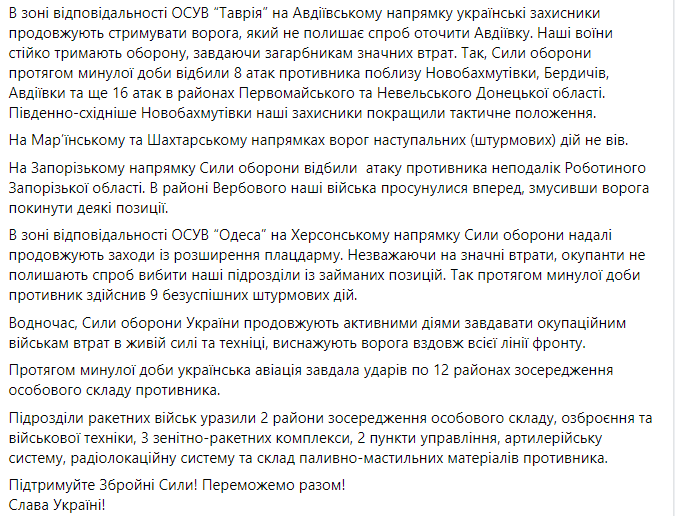 "В зоне ответственности ОСУВ "Таврия" на Авдеевском направлении украинские защитники продолжают сдерживать врага, который не оставляет попыток оцепить Авдеевку. Наши воины стойко держат оборону, нанося захватчикам значительные потери", — добавили в сообщении.