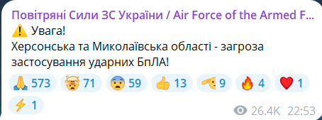 Обновлено 23:06. Военные пишут об угрозе вражеских беспилотников для Николаевской и Херсонской областей.