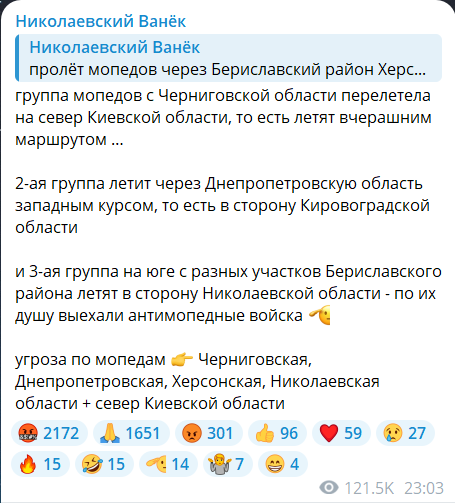 Обновлено 23:10. Паблик "Николаевский Ванек" сообщает о трех группах БпЛА, которые шарят в воздушном пространстве Украины. Первая группа летит через Киевскую область, вторая — в сторону Кировоградской, третья — Николаевской.
