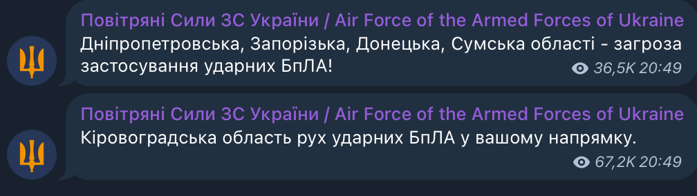 "Днепропетровская, Запорожская, Донецкая, Сумская области — угроза применения ударных БпЛА!" — отметили в ВС ВСУ.
