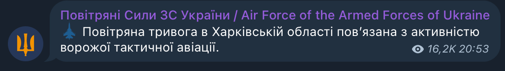 Также сообщается, что Харьковская область находится в опасности, которая связана с активностью вражеской тактической авиации.