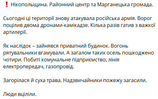 Сегодня Никополь и Марганецкую громаду Днепропетровской области снова атаковала российская армия. Враг использовал два дрона-камикадзе и тяжелую артиллерию.