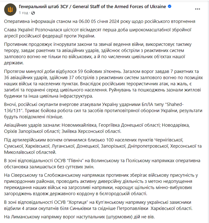 В Генштабе рассказали, что враг нанес семь ракетных и 36 авиационных ударов, а также совершил 37 обстрелов из реактивных систем залпового огня по позициям наших войск и населенным пунктам.