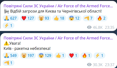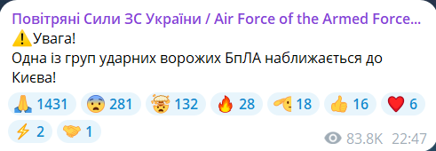 Обновлено 23:52. Воздушные силы сообщают о новых БпЛА, двигающихся в сторону Киева.