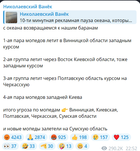В свою очередь паблик "Николаевский Ванек" сообщает о четырех группах беспилотников, двигающихся западным курсом и новой группе, которая появилась в Сумской области.