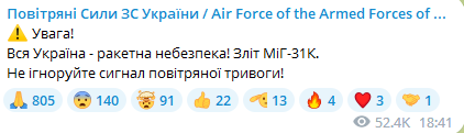 Воздушная тревога на территории Украины связана со взлетом истребителя МиГ-31К. Военные призывают украинцев не игнорировать сигналы воздушной тревоги и в случае опасности последовать в укрытие.