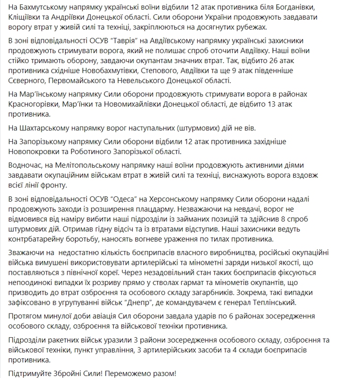 На Бахмутском направлении украинские воины отразили 12 атак оккупантов возле Богдановки, Клещиевки и Андреевки Донецкой области. Силы обороны Украины продолжают наносить врагу потери в живой силе и технике, закрепляются на достигнутых рубежах.
