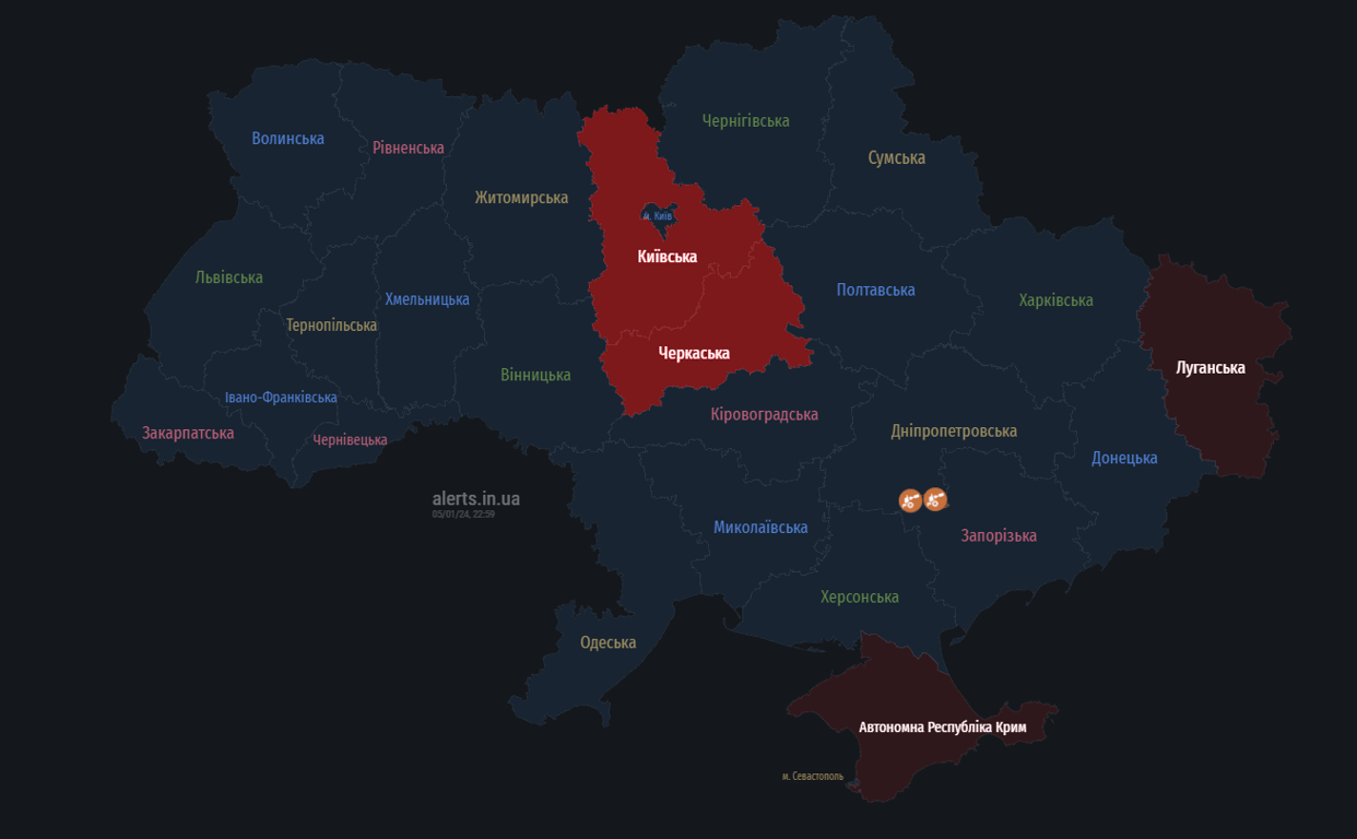 Оновлено: о 22:54: дрони вдерлися в повітряний простір Черкаської області, тим самим створивши загрозу Київській області з півдня.