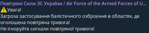 "Загроза застосування балістичного озброєння в областях, де оголошена повітряна тривога!" — йдеться у повідомленні.