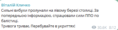 Мер Києва Віталій Кличко підтвердив інформацію про вибухи на лівому березі міста. За його словами, спрацювали сили ППО.