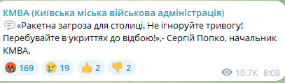 Глава КМВА Сергій Попко також підтвердив, що у столиці існує ракетна загроза. Він просить усіх жителів міста пройти до укриття та перебувати там до відбою тривоги.