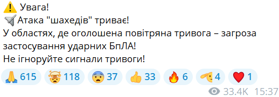 Водночас у Повітряних Силах наголосили, що атака "шахедів" триває.