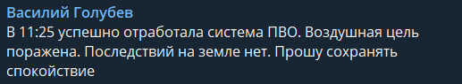 За словами Голубєва, об 10:25 успішно відпрацювала система ППО.