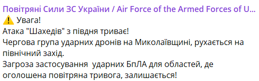 За повідомленням Повітряних сил, російські дрони-камікадзе рухаються з півдня.