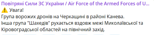 Одна з груп іранських дронів увійшла в повітряний простір Черкащини, безпілотники неподалік від Канева.