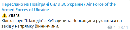Оновлено о 23:13: Повітряна тривога пролунала у Вінницькій області. На область летять дві групи Shahed-136.