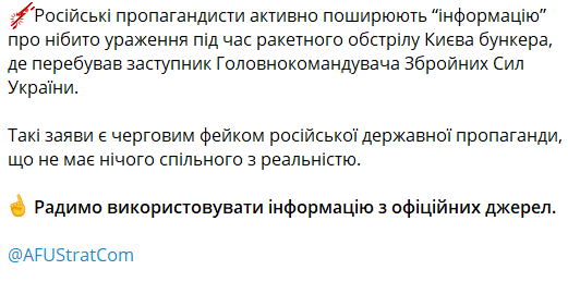 За їхніми словами, російські пропагандисти стали активно поширювати фейк про "ураження" під час ракетного обстрілу Києва "бункера, де перебував заступник Головнокомандувача Збройних Сил України".