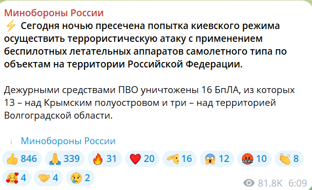 Також ворог повідомив, що черговими засобами ППО знищено 16 БпЛА, з яких 13 — над Кримським півостровом і три — над територією Волгоградської області.