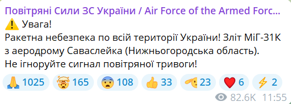 Там уточнили, що з аедродрому Саваслейка у Нижньогородській області РФ злетів ракетоносій МіГ-31К.