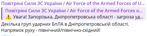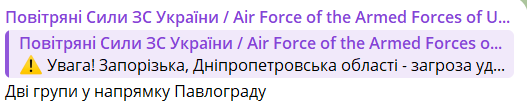 За повідомленням ВПС України, повітряна тривога для Запорізької та Дніпропетровської областей пов'язана з запуском дронів-камікадзе Shahed-136. Наразі дві групи рухаються на Павлоград.