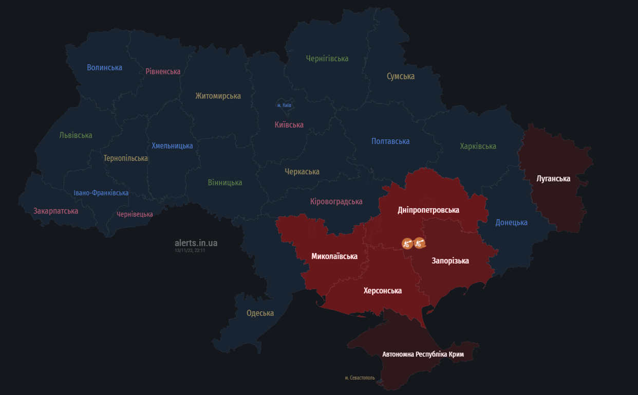 Станом на 22:12, карта повітряних тривог виглядає так: