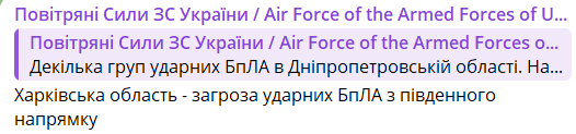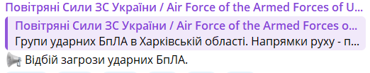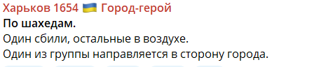 Оновлено о 21:43: місцеві пабліки Харківської області повідомляють про збиття одного з безпілотників в області, тоді як один дрон летить в бік міста.