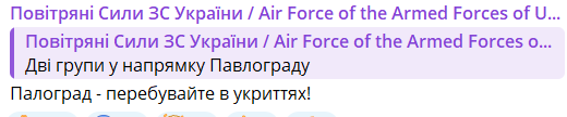 У ВПС закликали мешканців Павлограду перебувати в укриттях.