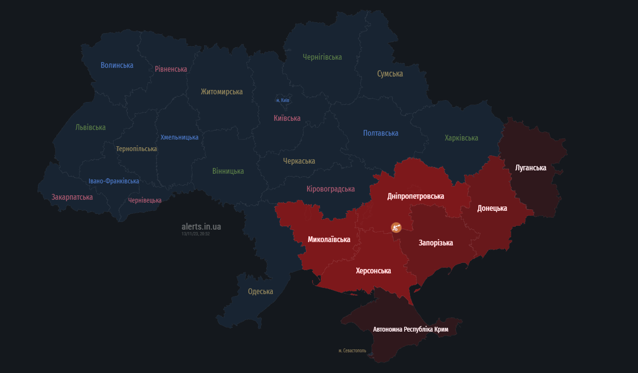 Станом на 20:52 карта повітряних тривог виглядає так: