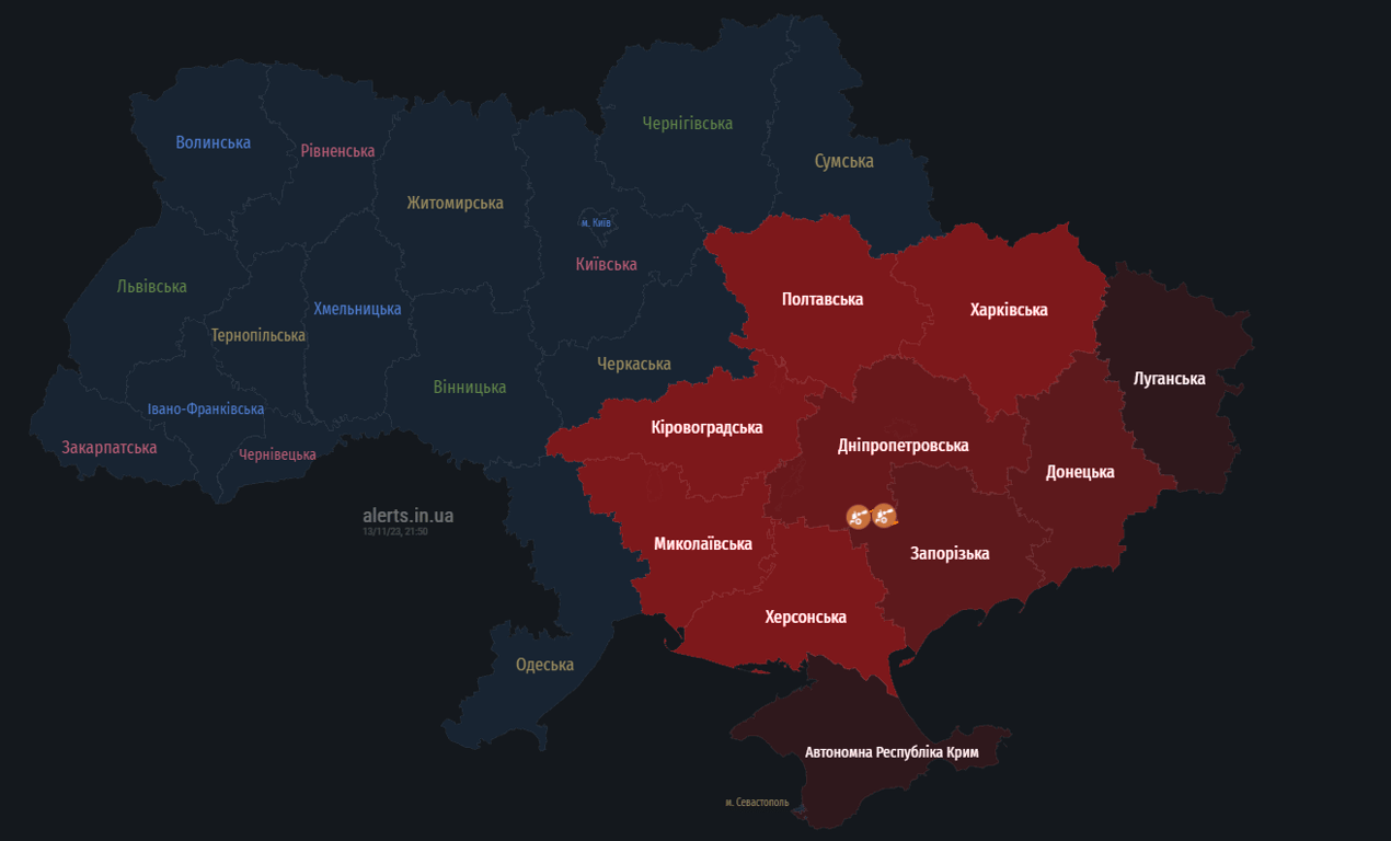 Станом на 21:50 карта повітряних тривог виглядає так: