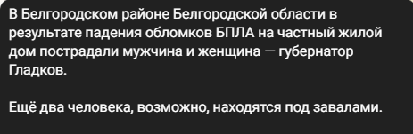Губернатор Бєлгородської області В'ячеслав Гладков підтвердив цю інформацію і повідомив, що двох постраждалих внаслідок падіння уламків доставлено до лікарні, а ще двоє людей, можливо, перебувають під завалами.