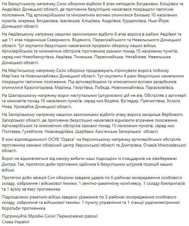 На Бахмутському напрямку Сили оборони відбили вісім атак, де противник безуспішно намагався покращити тактичне положення. Під артилерійським та мінометним вогнем опинилися близько десяти населених пунктів.