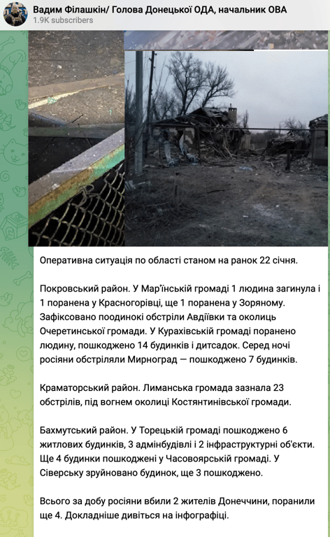 За даними Філашкіна, у Мар'їнській громаді Покровського району загинула одна людина внаслідок атаки ворога 22 січня. Також є поранені у Красногорівці, Зоряному, Курахівській громаді. В останній росіяни завдали нищівного удару по житлових районах. В населеному пункті громади пошкоджено 14 житлових будинків і дитсадок. Сьогодні вночі загарбники атакували і Миргород. В місті зазнали руйнувань сім будинків. Зафіксовано поодинокі обстріли Авдіївки та околиць Очеретинської громади.